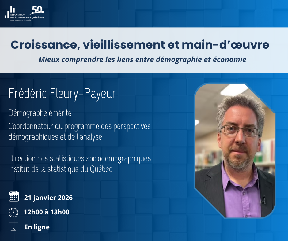 C’est monsieur Frédéric Fleury-Payeur, démographe émérite à la Direction des statistiques sociodémographiques de l’ISQ, qui viendra nous présenter ses plus récents travaux sur le sujet. Il est coordonnateur du programme des perspectives démographiques, en plus de travailler très activement sur la mortalité, l’immigration et les estimations de population.