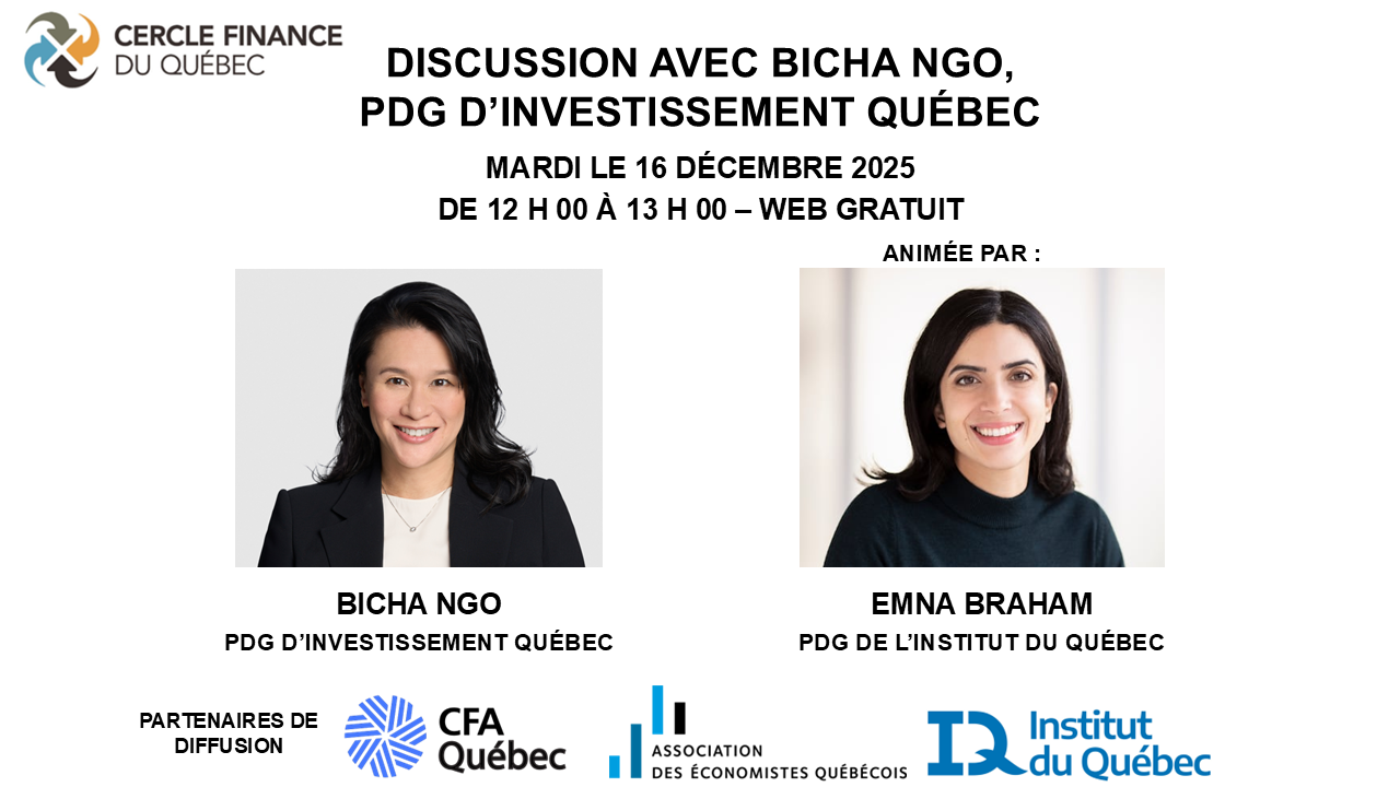 Mme Bicha Ngo discutera de la conjoncture économique actuelle du Québec, le rôle des agences de développement économique comme Investissement Québec (IQ), l’évaluation de leur performance, leur impact et les mécanismes d’accompagnement offerts aux entreprises.