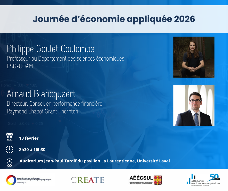 Dans le but de faire connaître davantage les activités du département d’économique et les perspectives de carrière en économique, le Département d’économique de l’Université Laval, l’Association des Étudiants en Économique des Cycles Supérieurs à l’Université Laval (AÉÉCSUL) et les centres de recherche CRREP et CREATE, en collaboration avec la section de la Capitale-Nationale de l’Association des économistes québécois, ont le plaisir de vous inviter à la Journée d’économie appliquée 2026.