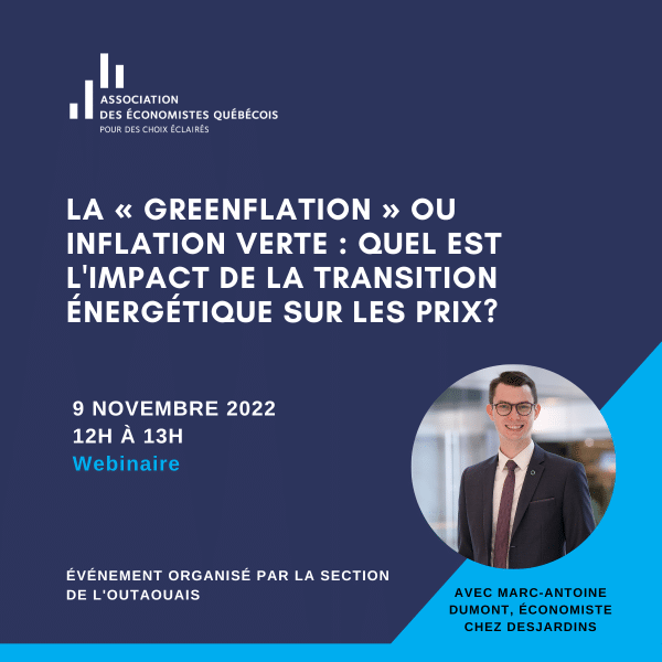 L’inflation est LE sujet de l’heure dans l’actualité économique. Mais qu’en est-il de l’inflation verte? La transition énergétique ainsi que le réchauffement climatique changeront impérativement notre environnement économique. Resserrement des normes environnementales, montée des océans et achat de biens écoresponsables, ces changements risquent de créer un débalancement où l’offre serait inférieure à la demande. Résultat : une hausse des prix connue sous le nom de greenflation. Marc-Antoine Dumont, économiste chez Desjardins, s’est penché sur le phénomène. Joignez-vous à nous afin de démystifier ce concept qui risque d’être de plus en plus sur toutes les lèvres.