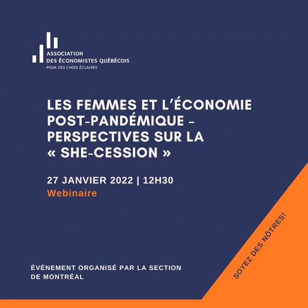 La section de Montréal de l’Association des économistes québécois vous convie à une discussion sur les femmes et l’économie pandémique avec Armine Yalnizyan, Fellow de la Atkinson Foundation on the Future of Workers, et originatrice du terme « she-cession » largement employé dans la presse anglophone pour caractériser l’impact de la pandémie sur les femmes.