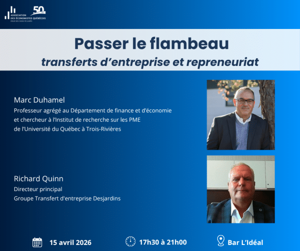 Joignez-vous à l’Association des économistes québécois pour un 5 à 7 convivial au Bar l’Idéal, en compagnie de Marc Duhamel et Richard Quinn, deux experts en matière de transfert d’entreprises. Ils partageront leur lecture du marché et leurs perspectives sur les enjeux économiques, financiers et stratégiques liés à la relève entrepreneuriale.
