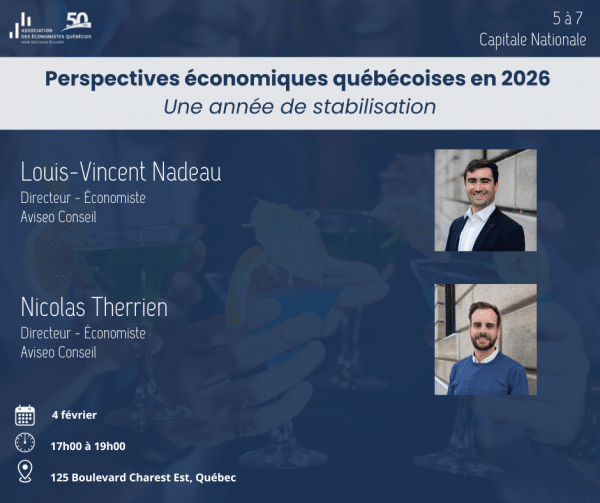 Pour en discuter, Aviseo vous invite à un 5 à 7 exclusif dans ses locaux. Cet événement intime sera une occasion privilégiée d’échanger avec nos experts et d’obtenir des perspectives éclairées sur les défis et opportunités qui façonneront l’économie québécoise en 2026.